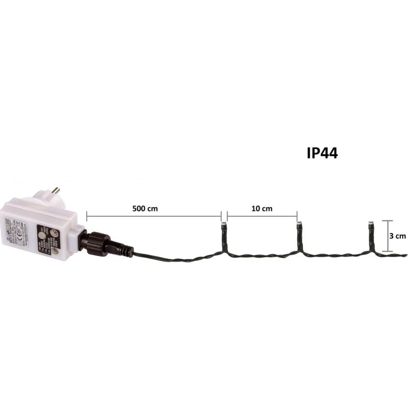 Pestrobarevný vánoční světelný řetěz využívající namísto klasických žárovek moderní úsporné LED diody. Tento typ řetězu má celkem 8 světelných funkcí – kromě trvalého svícení nejrůznější druhy blikání včetně časovače, který jej může pravidelně zapínat a vypínat. Řetěz má transparentní (průhledný) kabel, je voděodolný (vhodný pro vnitřní i venkovní použití) a délka jeho světelné části je 5 m (napájecí kabel má rovněž délku 5 m).