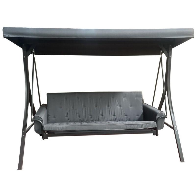 Stylová a velmi pohodlná rodinná zahradní houpačka pro 3 osoby ve stylu houpací pohovky s kovovým rámem a stříškou proti slunci. Provedení v šedé barvě o šířce 240 cm.