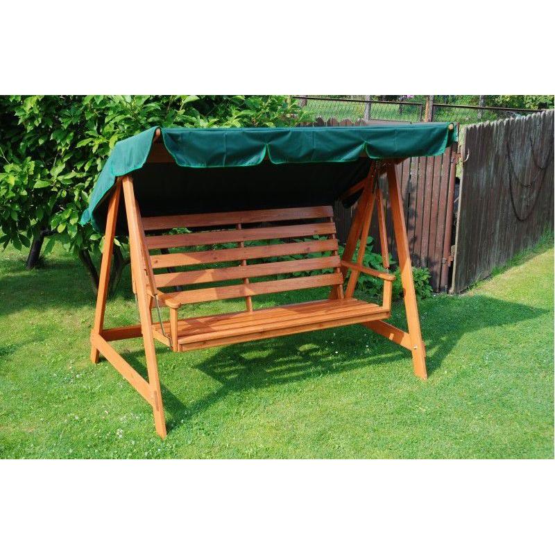 Dřevěná rodinná zahradní houpačka pro 3 osoby z masivního borovicového dřeva se zelenou stříškou ze zpevněného polyesteru.