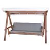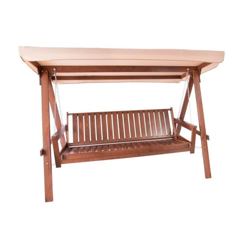 Zahradní houpačka (houpací lavice) s konstrukcí z masivního dřeva borovice, které je lakováno tmavě hnědým lakem. Rozměry houpačky jsou 235x170x118 cm (šířka x výška x hloubka). Dřevěné části jsou doplněné o textilní stříšku proti slunci a měkké pohodlné polstrování tloušťky 40 mm.