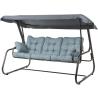 Rodinná kovová zahradní houpačka s možností rozložení na lůžko vhodná pro 3 - 4 osoby. Provedení s tmavě šedou (antracitovou) konstrukcí, šedou stříškou a modrozeleným polstrováním.