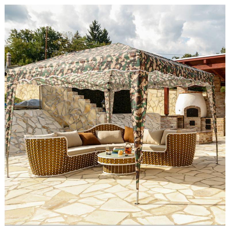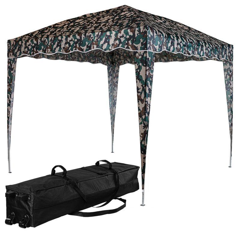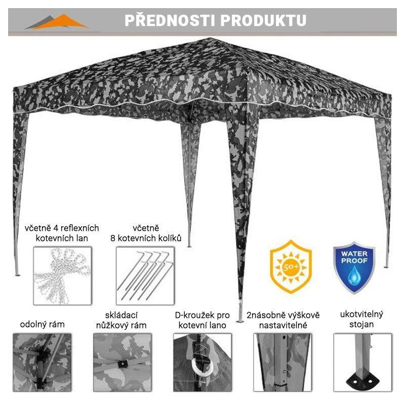 Nůžkový párty stan s rozměrem půdorysu 3x3 m v provedení maskáčové barvy a bez bočních stěn. Vhodný pro pořádání nejrůznějších zahradních akcí, na ryby, vytvoření stínu na dovolené, ale také pro marketingové akce, prodej zboží apod. Provedení se skládací kovovou nůžkovou konstrukcí a potahem z textilního materiálu v nepromokavém provedení. Součástí dodávky je praktická přenosná taška s kolečky.