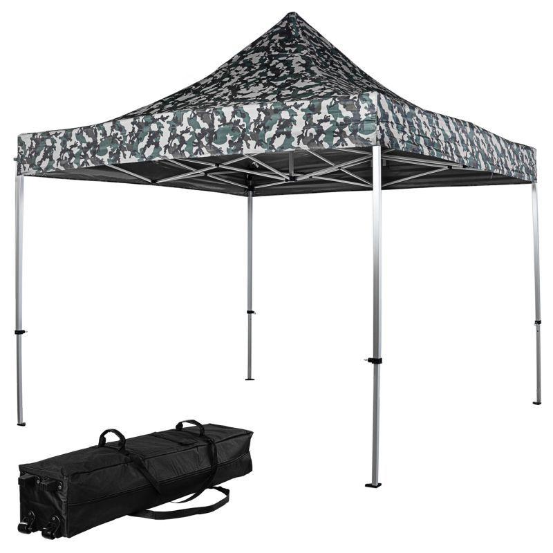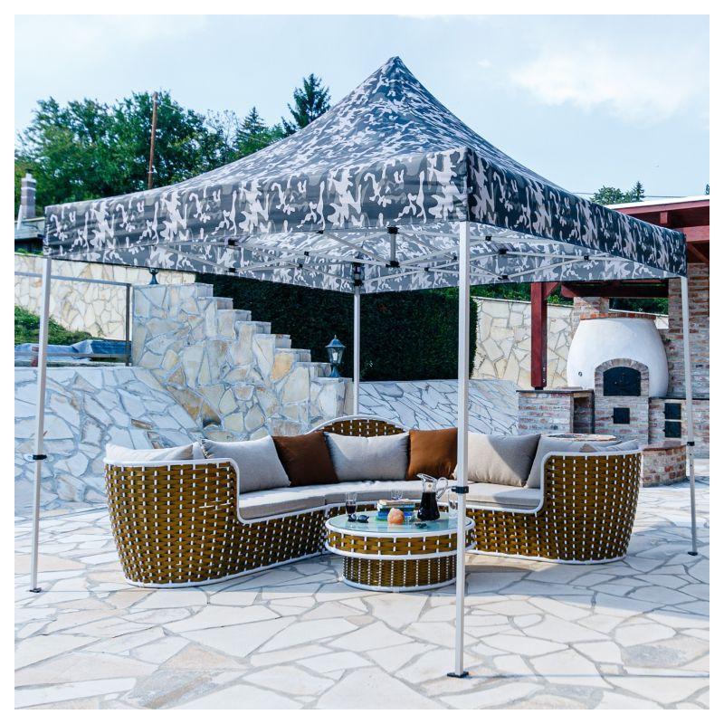 Skládací stan je vysoce kvalitně zpracován. Je totiž vodotěsný a díky speciálně impregnované střešní krytině blokuje až 98 % UV slunečního záření. Nerezový rám poskytuje ochranu vůči poškrábání a korozi. Pro další stabilitu a podporu slouží zvětšené nohy konstrukce, extrastabilní spojovací materiál a vysoce kvalitní klikací systém se zajištěním vnějším šroubem s tažným kroužkem. Pro podpororu střechy je intergrovaný středový napínací sloupek.