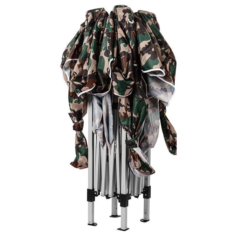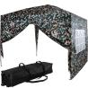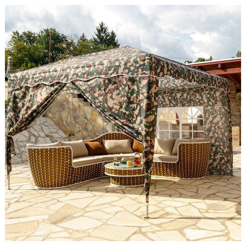 Nůžkový párty stan s rozměrem půdorysu 3x3 m v maskáčovém (army) provedení se 2 stěnami. Vhodný pro pořádání nejrůznějších zahradních akcí, na ryby, vytvoření stínu na dovolené, ale také pro marketingové akce, prodej zboží apod. Provedení se skládací kovovou nůžkovou konstrukcí a potahem z textilního materiálu v nepromokavém provedení. Součástí dodávky jsou 2 boční stěny (jedna plná se zipem uprostřed a jedna s oknem) a praktická přenosná taška s kolečky.
