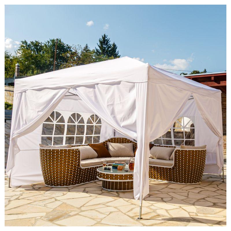 Zahradní párty stan v bílé barvě s rozměrem půdorysu 3x3 m. Ideální na nejrůzněší oslavy, večírky, svatby, ale také marketingové akce, prodej zboží apod. Provedení se skládací kovovou nůžkovou konstrukcí a potahem z textilního materiálu v nepromokavém provedení. Součástí dodávky jsou 4 boční stěny (2x se zipem, 2x s oknem) pro kompletní uzavření stanu a praktická přenosná taška s kolečky.