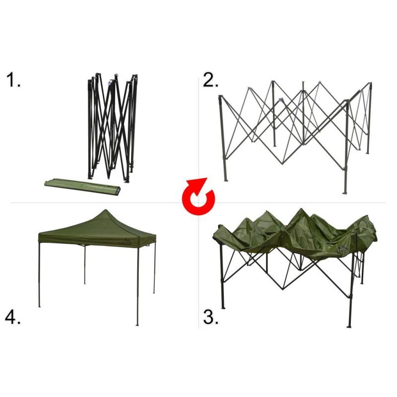 Párty stan o rozměru 3x3 m (výška 2,5 m) se skládací nůžkovou konstrukcí z kvalitní oceli, který Vás ochrání před sluncem a deštěm. Provedení s voděodolnou plachtou střechy ve vojenské zelené barvě. Bez bočních stěn.