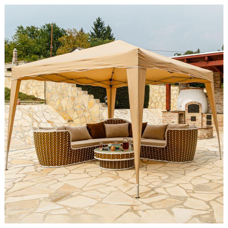 Zahradní altán ve skládacím nůžkovém provedení s rozměrem půdorysu 3x3 m. Kovový rám s textilní střechou z nepromokavého materiálu béžové barvy. Altán je bez stěn a je určený především pro ochranu před sluncem, případně dešťovými přeháňkami. Součástí je praktická taška s kolečky pro pohodlný přenos / převoz altánu.